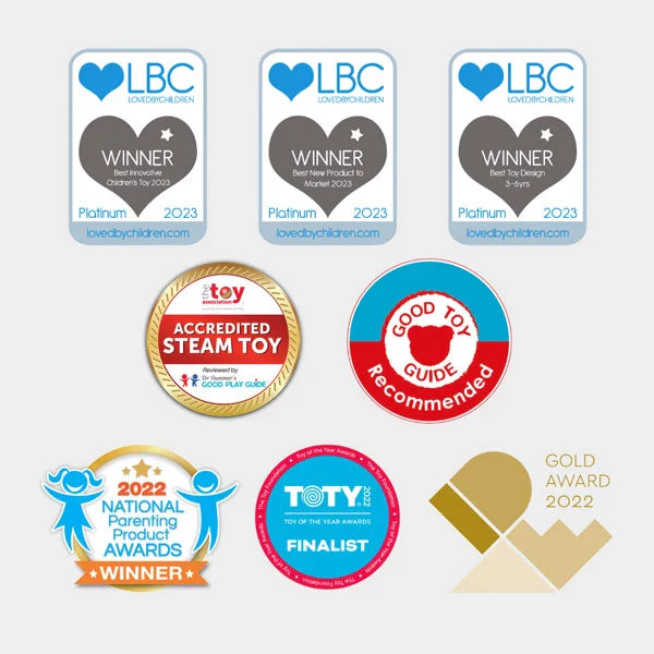 Notre engagement à offrir des expériences de jeu de haute qualité, sûres et attrayantes nous a valu de nombreuses récompenses, notamment la prestigieuse accréditation STEAM de la US Toy Association. Ces distinctions reflètent notre dévouement à créer des produits qui divertissent et contribuent au développement et au bien-être des enfants.